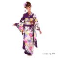 紫の地色に、たくさんのバラが描かれた絢爛豪華な振袖です。大きなバラの花には、ラメの糸での刺しゅうや、銀彩の加工もほどこされています。動くたびにキラキラと輝き、華やかさがいっそう増します。たくさんのバラの花以外にも、西洋由来の花が咲き乱れ、かなり重厚感のある仕上がりです。そんな花の合間を舞うように、「蝶(ちょう)」も、描かれています。蝶は、その姿も美しく、洋服やキモノの柄としても人気です。しかし、卵から幼虫へ、そしてさなぎから蝶へと、成長とともに姿を変えることから、「不老不死」や「長寿」の象徴とされてもきました。花の背景にある、薄紫のぼかしが少しセクシーな雰囲気をかもし出してくれています。花の量が多いのでずっしりとしていますが、りんかくだけの小花が軽やかな雰囲気を出し、バランスを取ってくれています。ハレの日によく似合う、あでやかさがあるおキモノです。