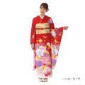 インパクトのある赤い地色が映え、「牡丹(ぼたん)」の花があでやかな振袖です。手の大きさほどに、大ぶりに描かれた牡丹。実物も迫力があるほど美しく、それを写実的に描くことで、繊細な雰囲気も加えられています。牡丹は「豪華」や「富貴(ふうき)」の意味を持つ文様で、古くから着る人の幸せを願って描かれています。さらに、花びらがたくさん重なり合っていてかわいい「八重桜(やえざくら)」や、どっしりした量感と品格のある「大菊」なども、いろどりを添えています。それに対して、黄色い小花が散らされているのが、軽やかで、愛らしい雰囲気を、細く長い糸菊の花びらのような形が、繊細さをかもし出しています。裾に向かってピンクの薄い色にぼかされているので、重心が下がらず、スタイル良く見せてくれます。上半身に柄が少ないため、落ち着いた雰囲気がかもし出されていて、オトナかわいいおキモノです。