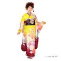 ひときわ明るい黄色の地色と、大輪の薔薇と菊の花が目を引く、主張のある振袖です。地色は、着物では珍しい、強い明るさを持つ黄色。その力強さゆえに単調な立ち姿となることのないよう、裾の濃い赤とのグラデーションとなっており、この赤もまた遠目にも目をひく色味です。そんなちょっと個性的な地色の上に描かれているのは、薔薇と菊の花。大輪の薔薇の花は濃淡を駆使し、花びらの質感が伝わってきそうな立体感です。菊は真ん丸くデザイン化された姿が可愛らしく、弾むように配置された様子が振袖全体にリズムを与えていますね。そして、その周囲にも桜、牡丹、藤、糸菊と花々が賑わいを添えています。地色は主張のある強い色ですが、絵柄の色遣いは優しげなのは、全体の色遣いのバランスを考えてのことでしょう。着物の中で最も華やかな振袖を着るからには、他の着物にはない存在感のあるものを選びたい、そんな方にお薦めの振袖です。