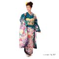 こっくりとしたエメラルドグリーンに、パステル調の草花の文様が、ハレの日に気分を盛り上げてくれる振袖です。キモノのポイントとなるところには、ボリューミーな「牡丹(ぼたん)」。そこにさらに金の糸で刺しゅうがほどこされているので、豪華さが増して、存在感のある雰囲気に。ほかにも、愛らしい「桜」や、品格もある「菊」の花が小ぶりに描かれ、華やぎをさらに加えています。たくさんの花の中にうもれるように「手毬(てまり)」も描かれています。手毬は円満を表します。そのものが装飾をされていて、キレイでもあるため、とても人気がある文様です。背景には、お祝い事に欠かせない「熨斗(のし)」の文様が、美しいリボンのように表現され、小花と花びらとともに風に舞う姿が、とても軽やかな柄ゆきに表現されています。こちら背の高い方向けのおキモノになります。花が小さめの柄ゆきですので、身長を気にせずお召しいただけます。
