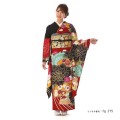 和の趣を漂わせつつ、オリジナリティあふれる表現で魅了するのがKANSAI デザイン。アート感が強いこちらの振袖も、鮮烈なインパクトを与えます。真っ先に目に飛び込んでくるのは、大きな牡丹の花。赤の地色部分には黒の牡丹を、黒の地色部分には赤の牡丹を置いて、鮮やかなコントラストを印象付けています。牡丹といえば、美しい女性の例えとして用いられる花。晴れの日を迎えて輝く女性がまとうにふさわしい文様と言えるでしょう。正面の一輪には豪華な金糸の刺繍があしらわれ、ひときわ美しい光沢を放ちます。牡丹の横に描かれているのは檜扇文。平安時代に貴族が用いていた扇を意匠化したもので、末広がりの縁起の良い形から、振袖や留袖にもよく用いられます。伝統的な古典柄を現代感覚で表現した、個性豊かな一枚です。