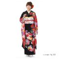 ラメが施された黒地に、古典柄の美しさが際立つ和の一着。「黒」のお着物というと、暗い印象を持つ方も多いかもしれません。しかし「重厚感」や「高級感」でいうと、黒色に勝る色はありません。全体をキュッと引き締め、大人っぽく仕上がる黒色の振袖は、大人の女性の美しさを引き出してくれます。黒地に描かれた美しい花々の文様は、古典的な美しさと神秘的な雰囲気を演出します。ピンク、黄色の“牡丹”の花は鮮やかで華やかをプラスします。紫の藤の花は、エレガントで上品です。全体的に描かれた赤い花は、黒地に際立ち、古風な雰囲気で和の美しさをさらに強調するようです。そして花々の間を優雅に舞う蝶の姿。こちらが非常に上品で優雅ですね。シックで大人の雰囲気漂う中に、鮮やかな花や、華麗な蝶が若々しさや可愛らしさをプラスします。大人の女性にふさわしい、美しい振袖です。