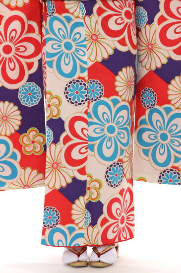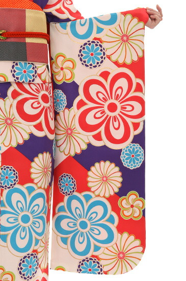 ビビットな色使いとレトロな文様が印象的なこちらの振袖は、華やかでおめでたい席にぴったりの1着です。「梅」と「菊」が可愛く文様化され、明るい色でポップに仕上がってますね。どちらも古来より着物に使われてきた歴史のある文様で、非常におめでたい意味を持っています。「梅」は春が来る前のまだ寒い時期に花を咲かせます。そんな寒さを耐え凌いで美しく咲く姿に、昔の人は強さと気品を重ねていました。また「菊」は古くより長寿を象徴する花であったと同時に、災いから身を守ってくれる縁起物でもあります。そんな2つの古典文様が豪華に大胆に配置されているデザインが今っぽくて、古さを全く感じないところがこの振袖のおしゃれなポイントです!地色は斜めに色が配置され、その上に置かれた「梅」と「菊」はくるくる回り出しそうな可愛い色使い。まさにポップです!古典文様と現代的なデザインが見事に融和して、オリジナリティ溢れる個性的な仕上がりになっています。周りの人とちょっぴり差をつけたいなら、おすすめしたいレトロポップ振袖です!