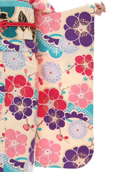 パッと花開いたようにキラキラとしたこちらの振袖は、縁起の良い「梅」「菊」「松」の文様が大きく描かれ、気品ある女性の美しさと可愛らしさを引き立てる豪華なデザインとなっています。描かれている3つの文様は古典文様であり、おめでたい意味を持った吉祥文様でもあります。「梅」は寒さを耐え凌いで冬に花を咲かす気品、「菊」は長寿と浄化を意味する縁起物。そして「松」は寒い冬にも緑を絶やさない強さ。古くから日本人がこれらの意味を重ね、大切にしてきました。そんな古典的な意味を持ちながらも、古っぽさを全く感じさせないデザインは現代を生きる女性にぴったり!また着物をパッと明るく仕上げてくれているのは金彩です。「梅」「菊」「松」の輪郭を上品な金彩で縁取り、更に梅のおしべを描く金彩がキラキラとした雰囲気を出してくれています。派手すぎない金彩使いが上品で可憐さを引き立てる豪華な1着です。