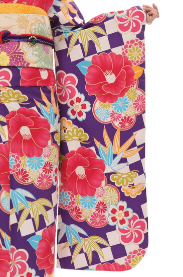 大胆な椿の配置と鮮やかな色味がポップでモダンな雰囲気全開の1着!そんなモダンな要素だけでなく、古典の美しさもしっかりと持っているのがこちらの振袖の一番のポイントです。描かれている文様は「椿」をはじめとする「松竹梅」「菊」「市松模様」など古くからおめでたいと言われてきた古典文様ばかり。「椿」は春の訪れを告げる花と言われ、平安時代より魔除けとしても大切にされてきました。「松竹梅」は松竹は冬に緑を絶やさず、梅は冬に花を咲かせることからどちらも寒さを耐え凌ぎ生きる強さと気品を表します。「菊」は災を遠ざけるお守り、「市松模様」は2色の正方形が入れ替わる有職文様という貴族の衣装などに使われてきた格式の高い文様。どれも古くから大切に着物の柄として使われてきました。こちらのお着物の中心的存在である「椿」は特に顔まわりにたくさん配置され、顔色を明るく見せてくれます。着物全体に元気な色味が使われ、着る人も周りの人も笑顔にしてくれる華やかな振袖です。