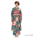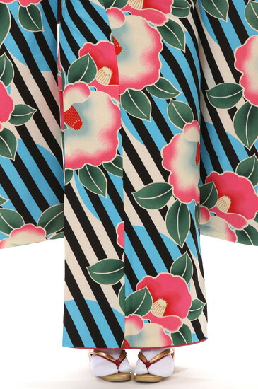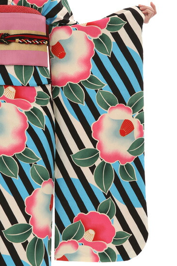 モダンなデザインと色使いが目を引くインパクト絶大の振袖です。黒の斜め縞、通称「レジメンタル」はネクタイの柄のイメージが強いですが、それを大胆に着物全体にあしらっています。個性的であり、華やかで目立つこと間違いない、キュートな1着。「椿」は春の訪れを告げる花として古くから日本で愛されているお花です。茶室の庭に植えるなど、身近な存在でもありました。その華やかな姿から、女性の気品を引き立たせるとして、着物の文様としても使われてきた長い歴史があります。そんな古典的な「椿」を大きく配置し、ライトブルーとストライプのコントラストでさらに印象的に仕上げている所がこちらのお着物のポイント!椿のピンクが映える色使いとなっています。英国発祥の「レジメンタルストライプ」を使って西洋のデザインを取り入れながらも、日本の古典とうまく組み合わさったこちらの振袖は、現代を生きる女性にぴったりなモダンレトロな仕上がりとなっています。