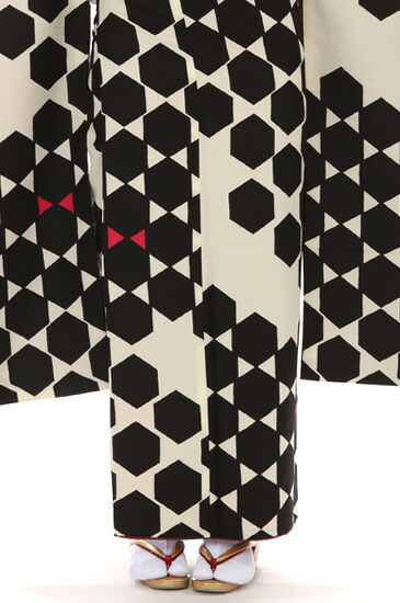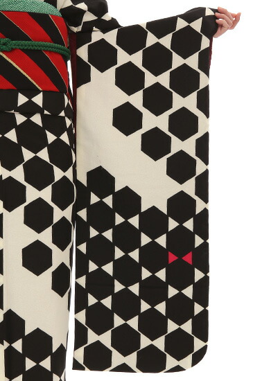 白地に黒の模様がとてもアーティスティックで印象的な振袖です。黒の模様は六角形をしています。モダンな幾何学模様にも見えますが、この六角形は亀甲模様でもあるのです。亀甲模様というのは、伝統的な古典柄のひとつでもあります。亀甲という名前があらわすように、亀の甲羅をもとにしているデザインです。「鶴は千年、亀は万年」と言われるように、亀甲模様には長寿などの意味が込められているおめでたい柄です。こちらのお振袖では、亀甲模様の角と角が上下になるように並んでいます。よく見ると、角と角がぴったりくっついているところもあれば、角と角が離れているところもありますね。ほんの少し離れているところや、たくさん離れているところ、亀甲模様がないところなど、場所によってちょっとずつ柄がちがうのが特徴です。亀甲模様がぴったりくっついているところは白い三角のところが花びらのようにも見えます。亀甲模様のない白いところに目をやると、先端が6つの星の形が隠れているようにも見えますね。ところどころにある赤い三角もポイント。リボンのようにもちょうちょのようにも見えて、かわいらしい印象を与えます。色も模様もシンプルですが、いろいろな見え方があるのが魅力です。お振袖の柄に合わせた帯もモダンですてきですね。