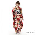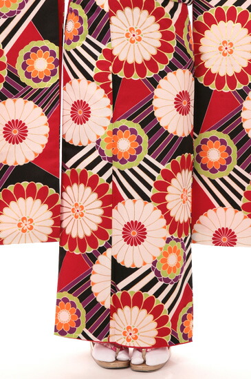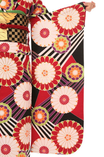 一面に描かれた大輪の花がとても印象的なお振袖です。こちらは手鞠(てまり)に菊をあしらったデザイン。手鞠はボールのような丸い形をしています。今は見かけることは少なくなりましたが、むかしは女の子の遊び道具として使われていました。丸い形から、物事がまるくおさまることや子どもの成長を願う親の気持ちが込められたモチーフでもあります。手鞠に描かれた菊はおめでたいものとされる吉祥の花。皇室の御紋にも使われている高貴なイメージのある花です。大きな菊は紅白の色で描かれているので、色からもおめでたい印象が伝わってきます。小さな菊はオレンジと黄緑と紫の配色。大きな菊とはちょっと雰囲気が変わりますが、和モダンな印象がきわだってすてきです。