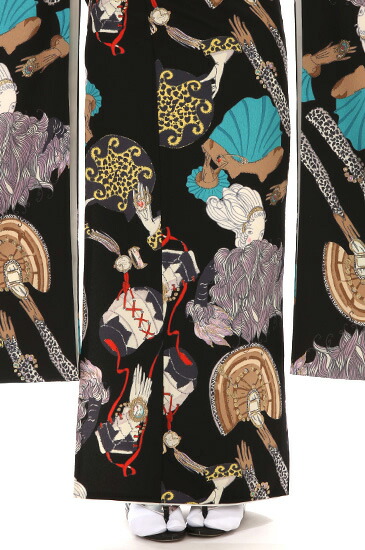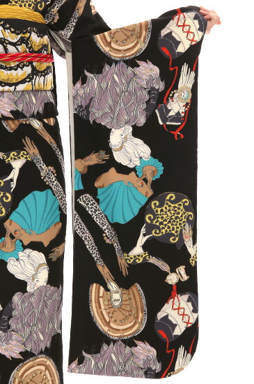 こちらはTSUMORI CHISATOがデザインしたお振袖です。fg_2644のホワイトと色ちがいのデザインになっています。TSUMORI CHISATOが自由な発想で素直に表現したお振袖のブラックバージョンです。ガーリィでセクシー、大人のためのファンタジーがあふれる、ハッピーなテイストがコンセプトのTSUMORI CHISATOブランド。同じデザインでも地の色がホワイトからブラックに変わるだけで、ガラリと雰囲気がかわりますね。ブラックバージョンは、セクシーさや大人のためのファンタジーの要素がより際立っているように感じられます。描かれているのは女性の姿や女性が身に着けるアイテムなど。あざやかな赤や水色、ゴールドの装飾がブラックによく映えます。TSUMORI CHISATOのファンの方はもちろん、ひととはちがったお振袖を着てみたい方にもおすすめです。