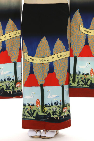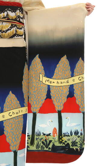 こちらはTSUMORI CHISATOブランドのお振袖です。fg_2646と色ちがいのデザインです。おとぎ話や童話にでてきそうなメルヘンな情景がファンタジックに描かれています。白鳥や水辺を彩る草花、猫がかわいらしいですね。あざやかな赤、それとはうってかわって深みのあるネオビー、そして黒へとグラデーションしている色づかいがとても印象的です。木の葉の中に小さなドットがところどころにありますが、猫の顔のように見えませんか?木の葉の中でかくれんぼでもしているのでしょうか。とてもかわいらしいですね。お袖を見ると、裾に近い方からあざやかな赤、深いネイビー、黒、そして明るいベージュ系の色に空の色が変わっていく様子がわかります。お着物は長い着物を折りあげて着るのにおはしょりという部分をつくります。着る方の身長にもよりますが、その折り込む部分にだいたい黒からベージュへと変わるグラデーションのあたりがきます。着付けるとおはしょりが明るいベージュで裾の部分が黒にパッっと切り替わったようになります。グラデーションもきれいですが、コントラストもはっきりとした様子もこのお振袖ならではの魅力です。