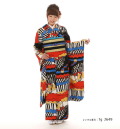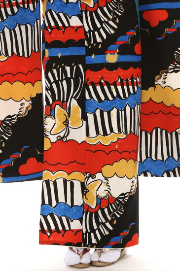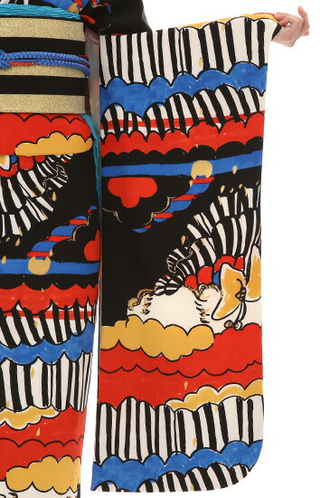 赤、青、黄色、そして白と黒が目にもあざやかなお振袖です。好きなものを自由な発想で素直に表現しているデザイナー、TSUMORI CHISATOの作品です。古典的な和柄のお着物とはまったくちがった雰囲気がありますね。黄色で描かれたちょうちょがこちらのお振袖のメインモチーフになっています。ちょうちょは伝統的な古典柄にもあるものです。愛らしいフォルムや華やかなすがたから古くから女の子のお着物にはよく使われてきました。同じちょうちょというモチーフでも、描く人がちがえばその表現もさまざまに変わります。TSUMORI CHISATOの表現するちょうちょはより自由に描かれているように感じられますね。ガーリィでセクシー、大人のためのファンタジーがあふれる、ハッピーなテイストを提供することをコンセプトとしているTSUMORI CHISATOの感性が光る1枚です。