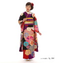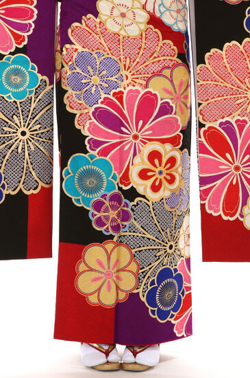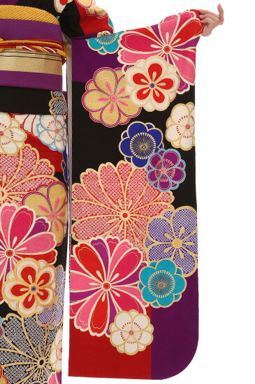 大きく描かれたお花の模様とお着物のシックな色合いが印象的なお振袖です。梅などのお花のモチーフはちょっと落ち着き目のカラートーンで描かれていて、レトロ感があります。ピンクや赤の暖色系とブルーやライトブルーの寒色系、そして、紫や白の色の組み合わせが絶妙です。梅は、古くから愛されてきたお花のひとつです。新しい元号・令和のもとになった万葉集の歌にも詠まれています。梅は、寒く厳しい冬を越え、暖かな春の訪れを告げるお花。そんな梅には希望という意味も込められているのだそうです。成人式など、大人の仲間入りや新しい門出のときに着るお振袖にはぴったりのモチーフですね。いろいろな色や大きさで描かれたお花もすてきですが、お着物のカラーも目を引くデザインです。シックなブラックがお着物のベースカラーになっています。そこに高貴な色と言われている紫と女性らしい赤がところどころに見えるデザインです。紫や赤が入っているので、ブラック一色だけよりも明るい雰囲気になります。お花の色にも紫や赤があるので、全体的にも統一感のある印象に。衿の部分が紫になっているところもポイントです。