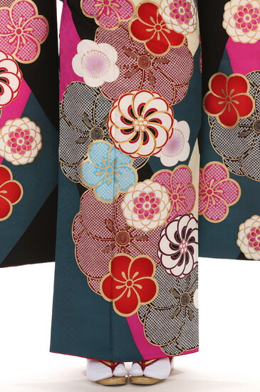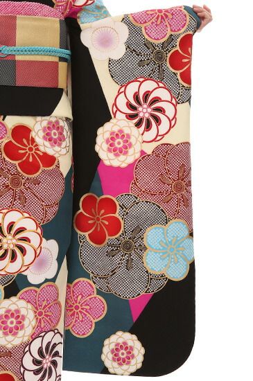 梅の花を主とした古典柄をモダンデザインに描いたこちらの振袖は、艶っぽさがほんのり感じられる、コケティッシュな着こなしができる一着になります。ダイナミックに様々な表情で描かれている梅の花。梅は百花の魁(さきがけ)といわれ、 厳しい寒さが残る早春に、春の到来を告げる吉祥文様です。モダンデザインな描写といっても柄は古典柄の梅。それも「捻梅(ねじうめ)」と呼ばれる伝統文様になります。捻梅は花弁が重なり合ってねじれているように見える梅の花の文様です。金彩で縁どりされた艶やかな梅。鹿の子模様が可愛い鮮やかな梅。同じく鹿の子文が施された大胆な赤と黒の梅に、所々、高尚な花とされる菊の花文様も豪華にあしらわれて。華やかな中にも個性豊かなデザインが広がります。梅の花文様をより引き立たせるのは、地色のフューシャピンク・ブルーグレー・黒・白で描かれた幾何学模様の色彩でしょう。特に鮮やかなピンクと黒のコントラストは、女性に色香を感じさせるコケティッシュなスタイルにさせてくれます。モダンデザインの中にも古典柄の花文様が楽しめる贅沢な一着。伝統的な意匠の振袖とはひと味違ったお洒落な装いを楽しんでくださいね。