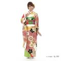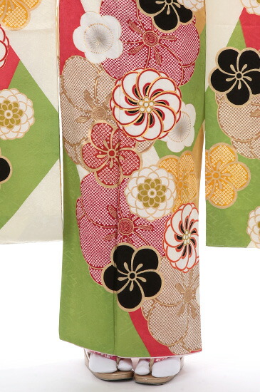 梅が咲き誇る古典柄をモダンデザインに描いたこちらの振袖は、快活な笑顔が似合う華やかさが素敵な一着になります。大ぶりな梅の花が様々な表情で描かれ時折、高尚な花とされる菊があしらわれています。百花の魁(さきがけ)といわれる梅と百花の中で最上位に位置するといわれる菊。古より日本人に愛好されてきた花はともに縁起の良い吉祥文様です。モダンデザインな描写といっても柄は古典柄の梅。しかも花弁が重なりねじれて見える伝統文様の「捻梅(ねじうめ)」になります。金彩で縁どりされた黒と白の対照的な梅。鹿の子模様が可愛さあふれる赤と黄の梅。同じく鹿の子文が施された大胆な赤とベージュの梅といった華やかさとモダンデザインの色彩豊かな美が広がります。梅の花文様をより際立たせるのは、地色の黄緑・桃・黄・白で描かれた幾何学模様のおかげでしょう。幾何学模様の色合いが梅の紅梅・白梅や明るい草木の色をイメージさせますので、振袖全体が梅の花が咲きこぼれる風景を演出しているようです。モダンデザインと伝統文様の華やかな花柄が調和したこちらの振袖には、明るい笑顔がとても似合います。装うときは、ぜひ素敵な笑顔も咲かせてください。