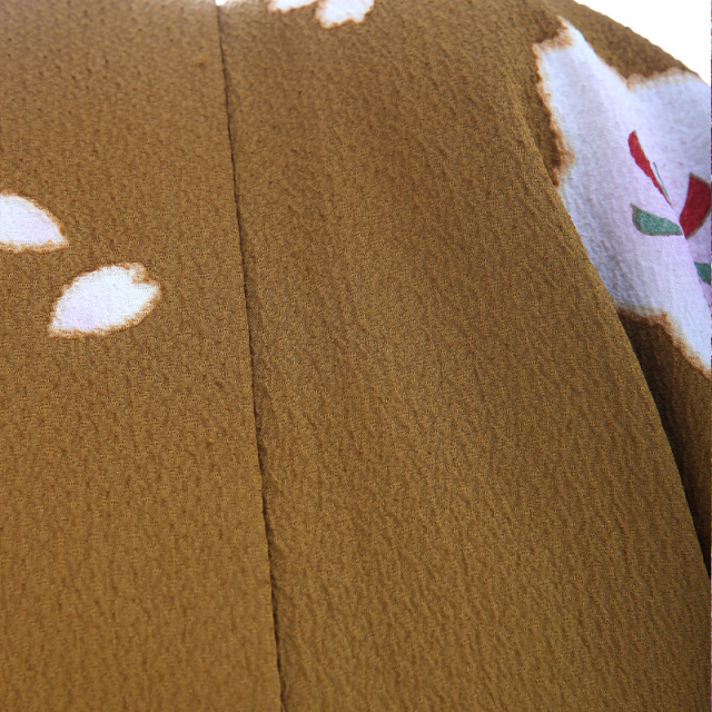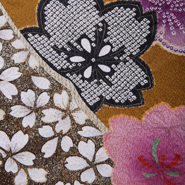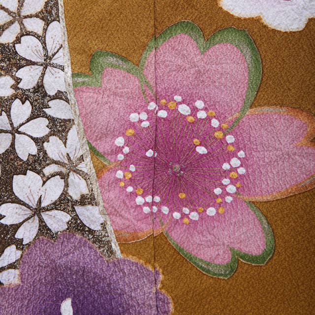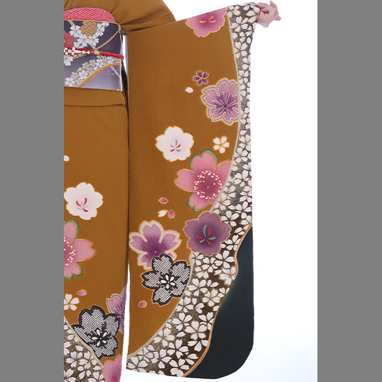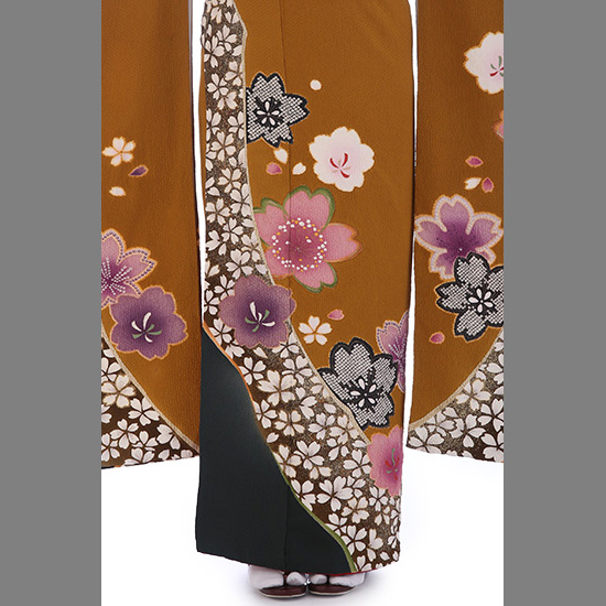 落ち着いた雰囲気の辛子色に桜尽くし。大人の甘辛ミックス感ただよう振袖です。遠くからでも人目を引くのは、上前正面を斜めに走る大胆なライン。同じラインが袖口から袂にかけても遣われています。この個性的なラインを区切りとして、裾にも袂にも、黒のぼかしが重厚感をプラス。桜花の持つ、優美なあでやかさを際立てています。なかでも見事な存在感を放つ花は、ラインのなかに詰められた小さな桜たち。金彩と撒糊散らしに引き立てられ、独特の美しさを輝かせています。さらに大輪の桜に添えられた中輪の桜に遣われた絞りが贅沢感を醸しています。黒の鹿の子絞りは、きりりと美しく。ひとめ絞りは、優美に。絞りは、繊細で高級感あふれる技法です。個性的なラインを模様に取り入れながらも、手の込んだ伝統技法が遣われている振袖は、スパイシーな女性に演出してくれることでしょう。