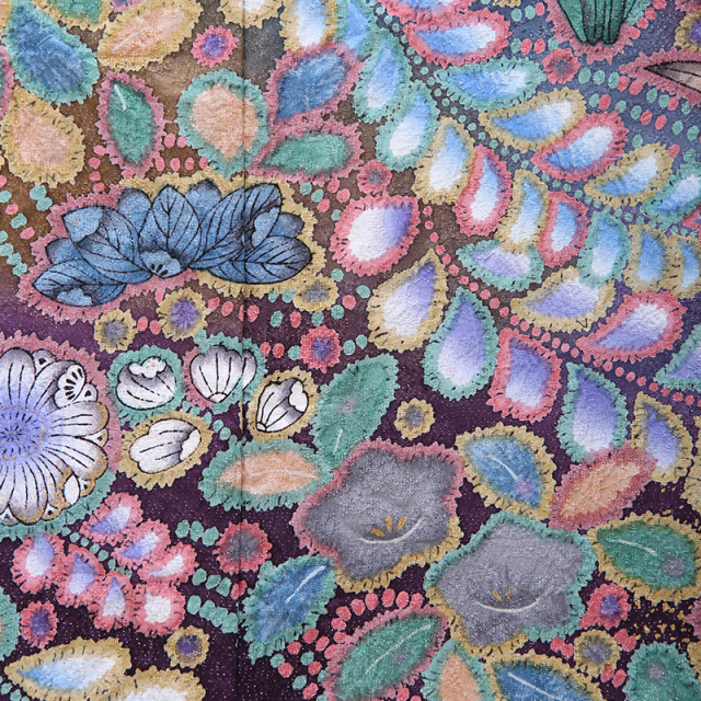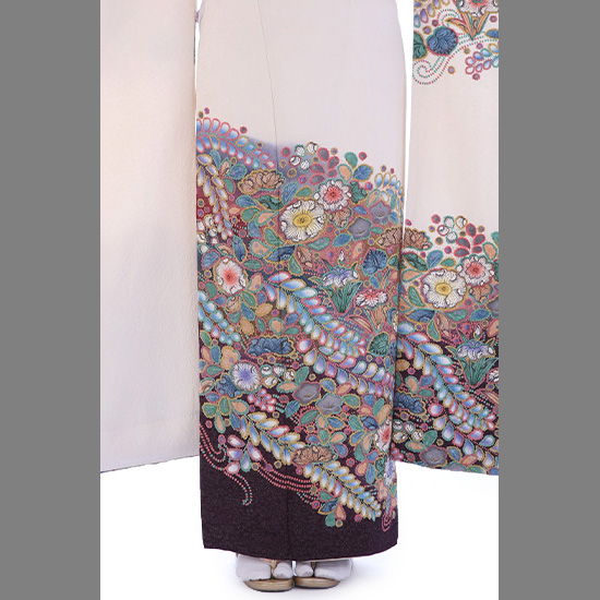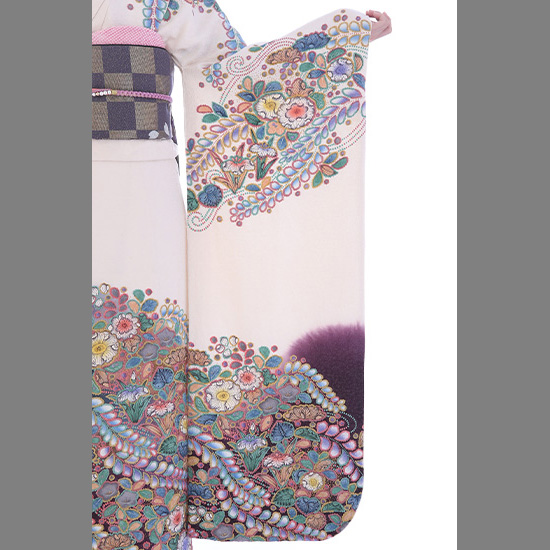 白の地色に、七色の「辻が花(つじがはな)」が咲く振袖です。辻が花は、桃山時代に流行した古典文様なのですが、一度姿を消し、近年に再び染められるようになりました。そのため「幻(まぼろし)」をつけてよばれることもあります。また、具体的にある花ではありません。辻が花の特徴は、草花をあるがままに表現することですので、虫食いや朽ちた花びらも描かれています。そのため「はかなさ」を感じることのできる文様です。 しかし、このおキモノの面白さは、それとは対局にあるような、美しい極彩色でいろどられていること。それにより感じられるのは、いきいきとした躍動感。そして、ファンシーで夢のような幻想的な世界です。それでいて、クラシカルな文様になりますので、落ち着きもあり、さまざまな方からも人気のあるおキモノです。