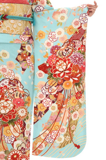 やさしい水色に、こっくりとした色合いで描かれた「手毬(てまり)」や「牡丹(ぼたん)」、そして「万寿菊(まんじゅぎく)」の文様が、とてもあでやかな振袖です。手毬は、女の子の遊び道具でした。そのため、愛らしいイメージがあり、とても人気のある文様です。また、その形から「円満」を表し、「魔除け」の意味も持つため、振袖にはぴったりの文様でもあります。その手前には、たくさんの花びらで大ぶりに描かれた牡丹が、金彩もほどこされて、きらびやかさが増しとても豪華に。同じく、たっぷりと花びらがあって、そのボリューム感がかわいい万寿菊と桜が、あでやかな雰囲気を加えています。背景には、お祝い事の贈り物にそえられる「熨斗(のし)」が、リボンのように描かれていて、絵柄に動きと軽やかさをかもし出してくれています。こちら、Sサイズのおキモノですが、全体的に軽やかな柄ゆきですので、かわいらしく着こなしていただけます。