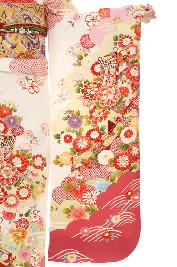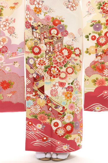 温かみのあるホワイトの地色に、あざやかなピンクの配色でまとめられた、あでやかな振袖です。花びらがたっぷりと描かれて、豪華なイメージの「牡丹(ぼたん)」。丸くボリューミーなかわいらしさの「万寿菊(まんじゅぎく)」。やはり花びらの数が多い「八重桜(やえざくら)」。どれも、存在感のある描かれ方でありながら、色調からやさしさとかわいらしさもある花になっています。また、金や色糸でところどころを刺しゅうされ、華やぎが加えられています。その花に囲まれるように「御所車(ごしょぐるま)」や「幔幕(まんまく)」も描かれています。 御所車は、高貴な方の乗り物で、雅やかさから人気のある文様です。幔幕は、屋外に張りめぐらされる幕で、貴族たちの花見などをイメージさせます。そのため、高貴な存在を、この絵柄の中にイメージさせ、ストーリーを感じる柄ゆきとなっています。こちら、小さい方向けのサイズですが、上半身と裾に余白があるため、身長を気にせず、安心して着ていただける柄ゆきのおキモノです。