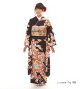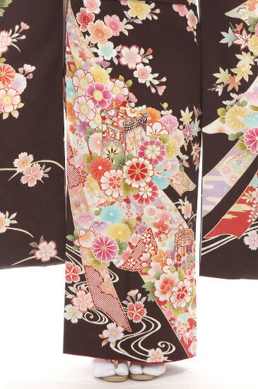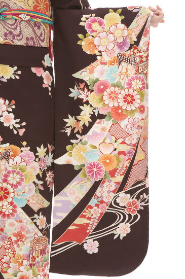 黒に近いこげ茶に、鮮やかな色彩で古典的な文様がえがかれた、クラシカルな振袖です。花の文様は、古典的な表現ですが、パステル調の色彩でやさしくかわいらしく描き出されています。さらに、金やラメの糸で刺しゅうがほどこされ、手間をかけられているとともに、きらびやかさが増しています。平安時代の姫君の乗り物で、雅やかさを表している「御所車(ごしょぐるま)」の文様も、美しく描かれています。また、こちらも姫君の遊び道具であった、貝を入れるための道具「貝桶(かいおけ)」の文様も、雅やかさと愛らしさをかもし出してくれています。背景には、お祝い事に欠かせない「熨斗(のし)」が、リボンのようにかぜになびくようで、華やかかつ軽やかです。落ち着いた色調に、高貴さが加えられ、着る人に上品な雰囲気をただよわせてくれるおキモノです。こちら、全体に程よい大きさで文様が描かれていますので、小柄な方でも安心して着ていただけます。