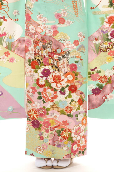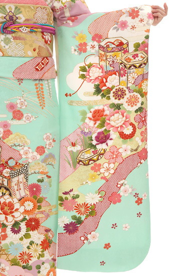 さわやかなミントグリーンに、ビビッドな配色で、古典文様であるのに、ハイセンスな雰囲気を持つ振袖です。ふんわりと大きな花びらが目をひく「牡丹(ぼたん)」や、高貴なルックスの「菊」、かわいらしく華やかな「桜」など、四季折々の草花が、古典的な描き方であるのに、美しい配色で、とても魅力的に描かれています。の花におおわれて「御所車(ごしょぐるま)」と「貝桶(かいおけ)」の伝統的な文様が、描かれています。御所車は、高貴な方の乗り物であったため、気品と華やかさを持ち、それをかもし出します。貝桶は、夫婦円満のなどの幸せを願う文様ですが、そのものが装飾されてとても華やかであるので、人気もある文様です。クラシカルな雰囲気もさせつつ、カラフルさが個性を際立たせることもできるおキモノです。こちらSサイズです。上半身に文様が少ないため、小柄な方でもすっきりと着こなすことができますので、ご安心ください。