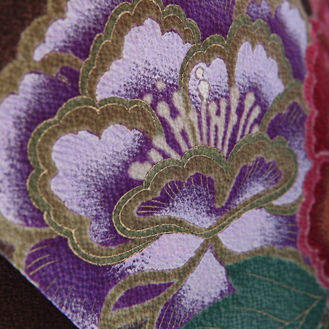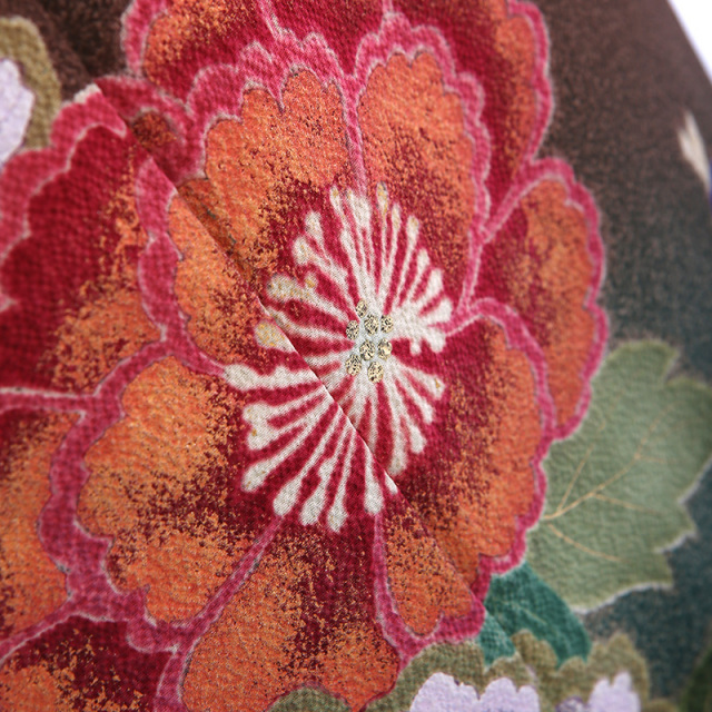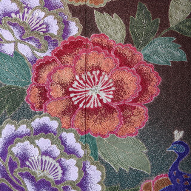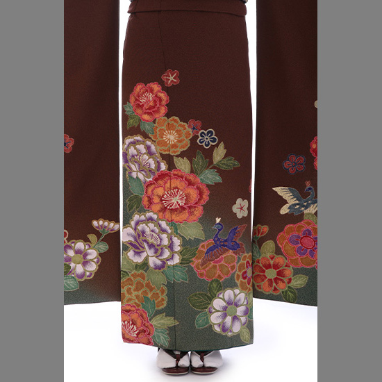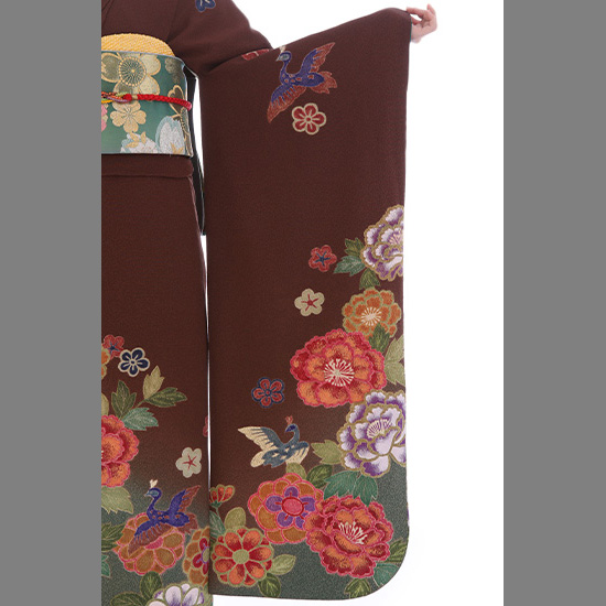 アズティック・ブラウンの地色に華麗に花々が咲き誇る振袖、幸運を引き寄せる瑞鳥と共に落ち着いた装いを織りなしています。アズティック・ブラウンは深みのある濃い茶色のことです。茶色は木や土といった自然を感じさせぬくもりや居心地の良さと言った安心感を与える色とされています。重厚感があり堅実さや信頼感を感じさせる色でもありますね。そんな深みのある色地に素敵な絵柄が描かれています。華麗に咲く牡丹の花は「幸福」や「高貴」などの気品高い意味が込められています。花びらの豪華さも存在感があふれる絵柄ですね。牡丹の横に一緒に描かれているのは、鸞(らん)と言う中国伝説の青っぽい羽根を持つ霊鳥とされている鳥です。鳳凰が年を取ると鸞(らん)になると言われていて神霊の精が鳥と化したものとも言われています。平安な知世に姿を現すとされています。鳳凰と同じく牡丹を好み一緒に描かれることが多いです。鳳凰から進化する鳥が存在したなんて驚きですね。ちなみに鳳凰から鸞そして所鳥になるそうですよ。控えめに描かれている梅の花、「学問に励むと梅が咲く」のことわざがあり貴族に大変好まれました。梅は寒い冬にいち早く花を咲かすことから忍耐があり生命力の象徴としてめでたいものとされています。