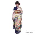 地色にクリーム色と紺色の二色を遣い、牡丹の花と御所車を中心に四季の草花を描いた、お洒落な振袖です。地色は、クリーム色と紺色の二色遣い。紺色を中心に、左は肩から帯下あたりまで、右は袖の上部にクリーム色を遣っています。描かれている文様は、牡丹の花と御所車、そして四季の草花です。牡丹は豊かさと美しさを象徴する富貴(ふき)の花。その豪華な姿から百花の長といわれています。御所車は平安貴族の乗り物、源氏物語などの絵巻を思い出される方もいらっしゃるのではないでしょうか。美しく装飾されており雅な雰囲気をまとうことができるため、礼装の着物を中心に和装では人気の文様です。これらの周りにも、藤や菊、松竹梅などを色鮮やかに描いています。二色の地色がいずれもベーシックな色のため、文様の鮮やかな色遣いが引き立ちます。地色が二色ぼかしというのは晴れ着には少なくありませんが、こちらの振袖の特長は、右肩と左肩が完全に二色に分かれていること。お顔のすぐ下にくる肩周りの色が左右で異なるため、写真の撮り方で印象が変わるなど、他にはない楽しみ方があります。ぱっと一目で目立つ個性ではないけれど、ちょっと他とは変わった楽しいものを、そんな装いをお探しの方にお薦めの振袖です。