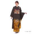 大人のニュアンスただようダークな地色に、ワンモチーフの花が大胆に咲く振袖です。渋いウコン色のぼかしに花開く、彩度を抑えた茶色の花々。その幻想的な美しさからは、都会的でスタイリッシュな雰囲気も感じられます。メインの模様は、茶色の花から浮き出てくるような不思議な色合いの二輪の花。まるで東郷青児が描く美人女性の肌のように、上品で妖艶な質感です。花芯はラメ糸で刺繍がほどこされ、妖しい煌めき。花びらから放たれた細い線は、ブルーグリーンの刺繍。これらの刺繍があることで花の立体感と浮遊感が強調されるだけではなく、着る人の動きにつれて微かな輝きが生まれます。それは、計算された美しさと言うべき魅力。セクシーなデザインです。この振袖のダークな地色と空想上の花との取り合せは、とても個性的です。スタイリッシュでセクシーな装いをお探しの方に、ぜひ!