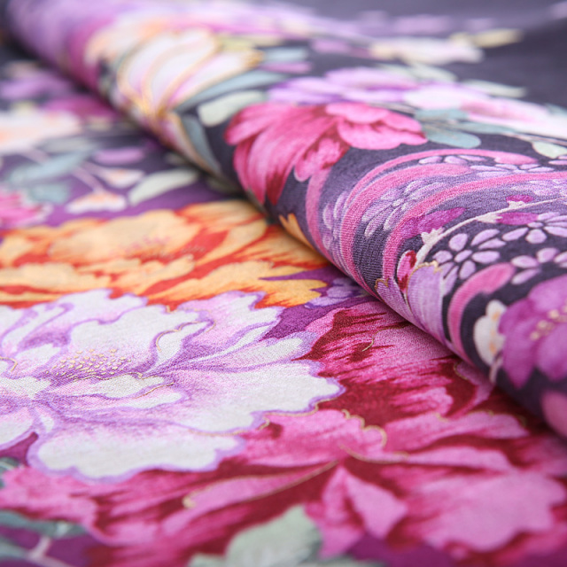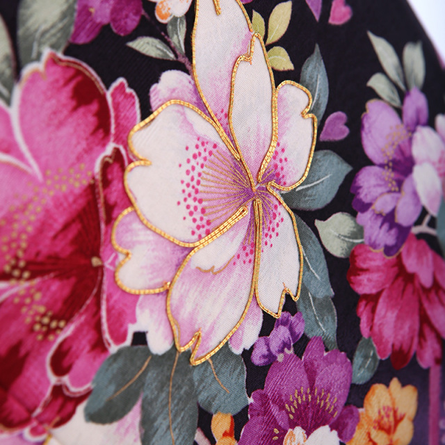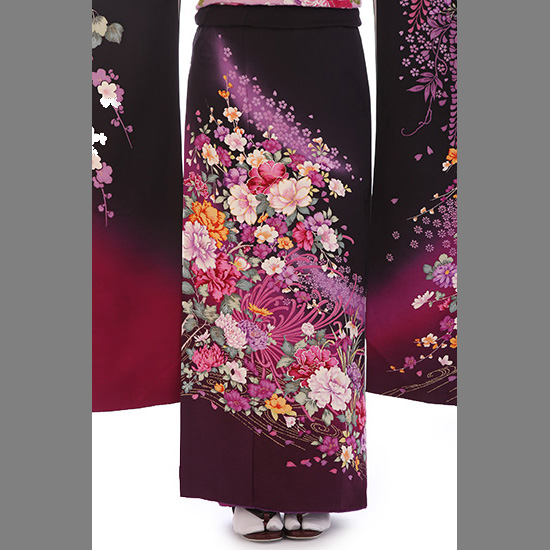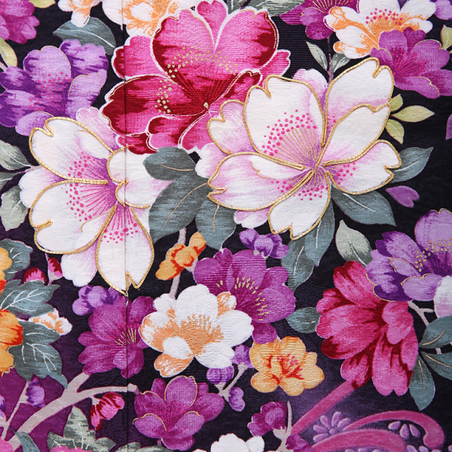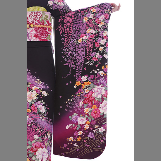 ハナエ・モリの振袖は、黒地に映える紫色が優美です。1951年の創業以来、日本のファッションシーンを絶えず牽引してきたデザイナーのハナエ・モリ。でも振袖世代にとっては、タレントの森泉や森星のおばあちゃんと言ったほうが、わかりやすいのかもしれませんね。ハナエ・モリブランドのテーマは「EAST MEETS WEST」。東洋と西洋の融合です。上前正面は紫の桜吹雪が花園に舞い降り、裾の流水に花々が遊ぶという構成です。メインの桜には金駒刺繍がほどこされ、存在感をアピール。膝のあたりに紫ぼかしが入り、そこから花々が生命を謳歌するように咲き誇っています。この紫ぼかしについてはむしろ、両袖の袂がすっきりと美しい色合いを見せています。向かって左袖の花模様とぼかしの比率も絶妙です。ハナエ・モリならではのセンスが散りばめられた振袖は、ロマンチックにして小粋な印象。ドレス感覚でお召いただける振袖なので、ちょっと個性的な大人の装いで臨みたい席にピッタリです。