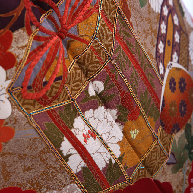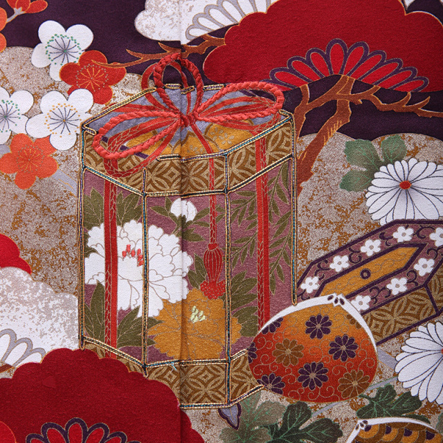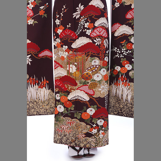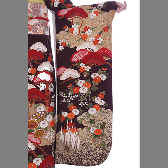 格調を感じさせる深い地色に、伝統技法を駆使したおめでたい文様を幾つも取り合せた振袖です。上前中央の雲取り文には金箔があしらわれ、たくさんの吉祥文が詰め込まれています。なかでも貝桶には刺繍がほどこされ、雲取り文から浮かび上がる立体的な表現に。貝桶は平安貴族の貝遊びの貝を入れて置く道具で、蛤と共に「夫婦和合」を意味します。そのワケは、二枚貝の蛤は対の貝としか合わないためなのだそう。金箔の雲取り文に次いで目立つ紅白の笠松文は、松を笠のようにデザイン化したもの。赤い笠松文のほかに、染め疋田(ひった)を詰めたものや白地に金箔を散らしたものまで、何個も重ねて「おめでたさ」を表わしています。笠松文の奥から咲く、梅の花は可憐そのもの。裾の雲取り文には竹の葉が置かれていますから、上前正面全体で「松竹梅」が完成します。おめでた尽くしの文様が並ぶこの振袖は、さまざまな式典や結納などの節目の日に最適。雅やかな気品で、そっと包み込んでくれます。