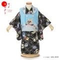 黒地の着物は上品で高級感があり、フォーマルな場面に適しています。被布の色は鮮やかな明るい水色で「 空色(そらいろ)」と呼ばれ、晴れた空のような美しい色味を表します。そして文様は縁起のよい吉祥文様「松竹梅」が描かれいます。厳しい冬でも緑を絶やさない「松」、雪に負けず青々とまっすぐに高く伸びる「竹」、冬が終わるといち早く花を咲かせる「梅」、辛く厳しい状況でも負けずに乗り越えてほしいという願いが込められ、また力強く生きることから長寿の意味も表す文様です。そして華やかな「丸紋」は、始まりと終わりがない文様として、円満、無限、人の縁を表します。細かく繊細な「絞り」は豪華で華やか、そして少し粋な印象を与えます。被布の中央の「兜」は勇ましく堂々とした存在感。戦さの際に武士の大切な頭部を守る道具とされたので、災いから守るお守りのような存在とされています。また豪華な装飾が施されていて格が高い武士のみが着用できたことから、一家の男の子にとって大切な大成や出世の願いが込められています。上品で豪華なこちらの晴れ着は、フォーマルさと可愛らしさが合わさっていて、非常におすすめの一着です。