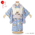 明るい色合いが爽やかで、着物地の薄い青紫色は「薄花色」と呼ばれます。名前の通り花を薄くしたような淡く可愛らしい色味で、平安時代から人々に親しまれました。被布の白とグレーのコントラストも淡い色合わせなので、全体的に優しく柔らかい印象。淡いグレーは「白鼠」と呼ばれ、銀色のように上品で明るい色味を指します。吉祥文様が沢山描かれており「松竹梅」はお祝いの着物には欠かせない存在。「松」は冬でも枯れずに、凛々しい姿を保ち、「竹」は雪に負けず折れにくく真っすぐ伸び、「梅」は早春に他の花より先駆けて美しい花を咲かせます。このような特徴から長寿、生命力、逆境でも負けない力を意味します。「丸紋」は、初めと終わりが無いことから円満、縁という縁起がよい意味があり、華やかな印象も与えます。そして大きく描かれる「兜」は、格が高い武士が着用する道具から、大成、出世の意味が込められます。また身体の中でも大切な頭を守るということから、災いから守り、成長を願うお守りのような存在です。絞りも豪華で、古典的で縁起のよい文様が沢山描かれた一着に、お祝いの想いを込めていただけます。