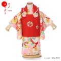 ガーリーな色使いが非常に可愛らしく華やかに仕上がっています。被布は鮮やかな「赤色」、赤には厄除けの意味がありお守りのような色味です。そして中央に「花丸紋」が描かれています。丸紋は始まりも終わりもないことから永遠の意味が込められます。そして「円=縁」を連想され、ご縁に恵まれるようにという願いがこもった縁起のいい文様です。一緒に花々が描くことで、可憐な印象を与えます。着物は「撫子色(なでしこいろ)」という撫子の花のようなピンク色で全体が染められます。撫子は「大和撫子」という言葉があるように、日本女性の美しさを表現する花です。上品で少し控えめな可愛さを感じます。そして描く文様は美しく彩り豊か。厳しい冬のあといち早く花を咲かせる「梅」、雪に負けず真っすぐに伸びる「竹」は、長寿の象徴とし、逆境にも負けない力強さを意味します。「菊」は放射線を描く花のかたちが太陽を連想させ、最も位の高い花とされ、高貴さを表します。「亀甲花菱」は、亀甲は亀の甲羅をモチーフにした六角形の文様のことで長寿を表し、中に菱型の花が描かれます。女の子らしい可愛い雰囲気ですが、慶事を象徴する伝統的な文様ばかり。この着物のように色鮮やかな人生になりますように、そんな願いを込めた一着です。