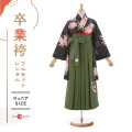 黒の地色に大胆な絵模様の菊が印象的な小振袖と袴のセット、大人の雰囲気を持つ神秘的な印象を感じさせます。黒は重厚で高級感を感じさせる色です。周囲の色を引き立たせ際立たせる効果もあります。その効果があり絵模様に使用されている大胆な菊の絵柄が引き立っていますね。