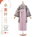 袴の、淡い紫色は「紅藤(べにふじ)」と呼ばれる伝統色で、やや赤みがかった藤色です、江戸後期に、若い女性向けに人気が出た優しく女性らしいカラーです。そして着物の地色は、「藤煤竹(ふじすすたけ)」。その名の通り、藤色に煤がかった暗い灰紫色です。同じ藤色でもこのような差があり、日本特有の美意識を感じる色合わせです。