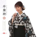 大人可愛い、上品で個性的なデザインの卒業式袴です。着物地の濃いグレーは「吉岡染(よしおかぞめ)」。染や色の名前としては、個人の名を冠した最も古い例であり、江戸前期に流行した伝統色です。同系の黒を袴を合わせて、お洒落なワントーンコーデになっています。