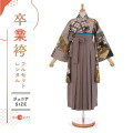 大胆な文様を描き方がお洒落な卒業式袴の紹介です。袴の灰がかった黄褐色は「胡桃染(くるみぞめ)」と呼ばれる伝統色。山野に自生する胡桃の樹皮や果皮の煎汁と灰汁で染めた色とされた色味が使用されています。