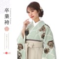 可愛い文様を、モダンに描いた落ち着いた可愛さが魅力のスタイルです。着物地のくすんだグリーンは「裏葉色(うらはいろ)」。木の葉や草の葉裏のような渋くくすんだ薄緑色で、爽やかで清潔感のある色味です。袴の薄茶色は「亜麻色(あまいろ)」と呼ばれ、亜麻を紡いだ糸の色のような柔らかさがあります。