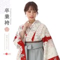 縁起のいい紅白のカラーに美しい花々が咲き誇る、おめでたい日にぴったりの装いです。「赤色」は厄除けの意味が込めれらており、お守りのような存在です。そして袴の明るいグレーは「銀色(ぎんいろ)」。白金とも呼ばれる、美しい金属光沢のあり、落ち着いた上品さがあります。