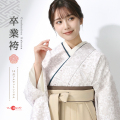 着物に描かれる文様は、特定のものをあらわすのではなく抽象的に表現した花々。どなたでも似合いやすく可愛らしいタッチで描かれており、ふんわりと上品に仕上がっています。そこに優しいベージュカラーの袴を合あわせ、清楚な装いにまとめました。