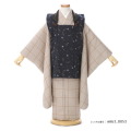 被布のわずかに青色がかった暗い鼠色は「紺鼠(こんねず)」と呼ばれ、深みがあり粋なカラー。そして着物地の薄い灰みがかった黄褐色は「利休白茶(りきゅうしらちゃ)」。わび茶道の祖、千利休をイメージさせる上品で穏やかな色味を使用しています。どちらも日本の伝統的な古典カラーで落ち着きがありますが、描かれる文様やデザインは非常に可愛らしさを感じます。着物地にはチェック柄に「千鳥格子」が描かれます。その名の通り千鳥に見える格子柄で、勝負運と豊かさを意味する縁起の良い吉祥文様の一つです。他にも被布には小花が描かれていて、蝶ネクタイをつけるなど子ども着物らしい遊び心がつまっています。レトロモダンな雰囲気が魅力のこちらの着物。特別感が大切なお祝いの日に相応しい装いです。