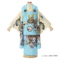 被布と着物地の淡い明るいブルーは「薄水色(うすみずいろ)」。文字通り水色を薄くしたような、淡い青緑色のことで、まさに晴れの日にぴったりなカラーです。文様は古典的で男の子らしい王道のものが描かれます。被布に描かれる「兜」。兜は、戦で頭を守る為に使用されてきた道具です。大切な頭を守るということから、災いから守り、長い人生で健康でありますようにというお守りの意味があります。また格が高い位でないと着用できないものなので、出世や大成の願いも込められます。「龍」は、神聖なる霊獣として尊ばれ、権力を手にした皇帝を象徴するシンボルとなり、さまざまな装飾に用いられ、強い力の象徴として好まれてきました。また、日本では水を司る神として、人々の信仰を深めたとされています。「打出の小槌」は一生物に困らないように、お金に困らないようにという意味があります。爽やかな色味に、おめでたい意味が込められた吉祥文様、飽きのこない正統派な装いです。