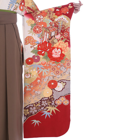 | 付属品 | 着物・袴・長襦袢(半衿付き)・半幅帯・伊達衿・巾着・草履・足袋(プレゼント)・肌襦袢(ワンピースタイプ)・腰紐4本・コーリンベルト・前板・伊達締め2本・衿芯 ※ブーツは付属されませんが、当店の有料オプションからレンタル可能です。 ※ブーツをご利用される場合、草履・足袋は付属されません。 |