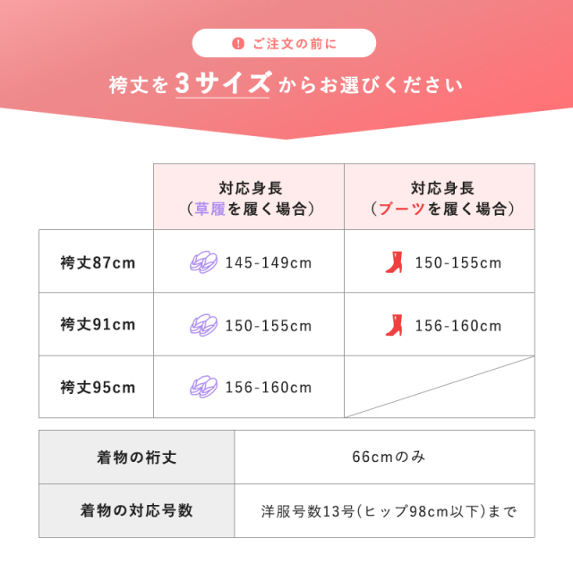 | 付属品 | 着物・袴・長襦袢(半衿付き)・半幅帯・伊達衿・巾着・草履・足袋(プレゼント)・肌襦袢(ワンピースタイプ)・腰紐4本・コーリンベルト・前板・伊達締め2本・衿芯 ※ブーツは付属されませんが、当店の有料オプションからレンタル可能です。 ※ブーツをご利用される場合、草履・足袋は付属されません。 |