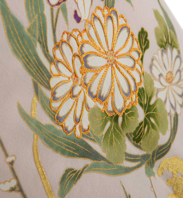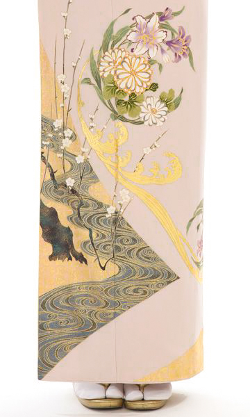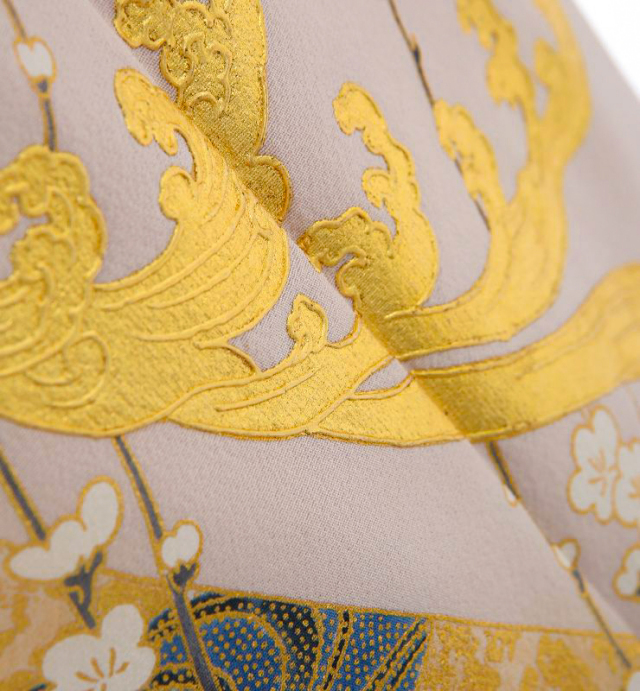 ウエディングドレス界をけん引してきた世界的に有名なブライダルファッションデザイナー桂由美。彼女が手掛ける色留袖はお着物の古典的な美しさは保ちつつ、現代的なセンスを取り入れた新鮮な美しさが特徴です。正統派でありながらハイセンス。それが幅広い年代の女性から支持される所以です。落ち着いた地色に、大胆な配置の絵柄がシックに並びます。古典的な絵柄なのに、どこかモダンでセンスを感じる一着は桂由美ブランドならではでしょう。百合と菊の花でデザインされた花丸文は、各々の美しさを共鳴し合うかのように咲き、華やかさをプラスしてくれます。流水文に白梅が描かれた風景は、まるで日本の美意識を体現しているかのよう。手描き友禅や箔で表現され、琳派の世界観を着物の中に再現しています。センスと気品ただよう一着は、着ている側にもそれを見る側にも、美しい喜びを与えてくれることでしょう。