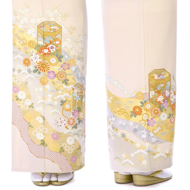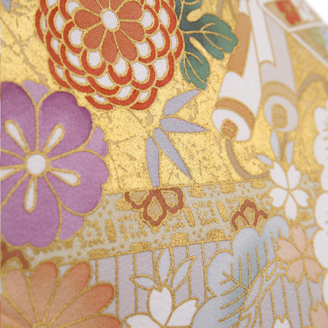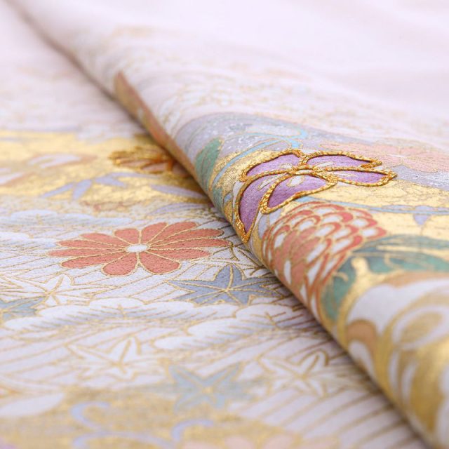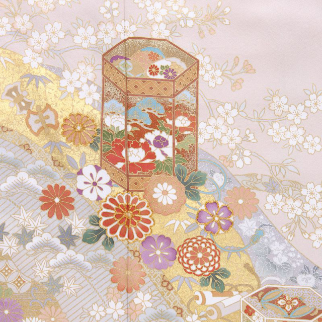 控えめなピンク色の地色の上に、色鮮やかに描かれた古典文様。貝桶を中心に、桜、菊、松、竹といった日本の植物、七宝、亀甲や宝尽くしの古典文様が描かれた、上品な色留袖です。貝桶は、姫君たちの雅な遊び、貝合わせの貝を入れる器です。貝桶それ自体にも美しい装飾が施され、その見た目の麗しさと共に、貝合わせの貝は他の組み合わせでは決してうまく合わないことから、夫婦和合の象徴として、縁起ものとされてきました。桜や菊の花々は真ん丸い形で愛らしさを、宝尽くしの品々や七宝、亀甲は動きを、与えてくれています。裾にほどこされた疋田(ひった)絞り柄も、古典文様と調和していますね。ウェディングドレスデザイナーとして著名な桂由美が古典的な着物というと、意外に思われる方もいらっしゃるかも知れません。しかし、桂由美は、染織や服飾をはじめとする日本文化にも造詣が深く、このように古典的なものから、西洋風のものまで、多様な着物をデザインし、高い人気を誇っています。西洋文化を熟知したからこそ描ける日本の古典の良さというものもあるのでしょう。帯は、留袖の文様の色味と明るさに合わせて、ピンク系の華紋が描かれた物を合わせました。古典文様は留袖の中でも特に礼装感を感じさせるものですね。幅広い世代の方に好感を与える着物らしい装いです。
