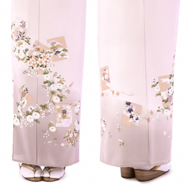 ほんのり紫がかった薄い灰色の地色に色紙文様(しきしもんよう)と菊(きく)が描かれています。色紙は、和歌や俳句、絵などを描く方形の厚紙でできたものです。その中に草花や山や波などの風景を描き、重ねたり散らして配置し、文様化して描かれてきました。こちらの色紙には、春と言えば桜のピンクを思い浮かべる程、日本人に古くから愛されてきた桜や厳しい寒さの中でも緑を絶やさない松、十二月から三月頃に咲くことから良い兆しの象徴とされ、常緑樹の中でも聖なる木として悪霊を払う力があると考えられ、神事(しんじ)に欠かせない木であった椿(つばき)、色づく姿が美しい楓(かえで)などが描かれています。色紙のそばには伸びやかに菊(きく)が描かれています。菊は、奈良時代に中国から薬草として日本に伝わり長寿の象徴として描かれてきた花です。日本の文化に根付いた菊は、様々な工芸品に描かれてきました。桜には金駒刺繍(きんこまししゅう)が施されてて華やかなポイントとなっています。淡い落ち着いた霞色(かすみいろ)のグラデーションの地色に色紙と菊がリズミカルに配置された素敵な一着です。