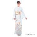 くすみを帯びたミントグリーンが裾(すそ)に向かってグレーへ変化するグラデーションの地色に椿(つばき)の花が描かれています。椿は日本原産の花であり、十二月から三月頃に咲くことから良い兆しの象徴となっています。また常緑樹の中でも聖なる木として悪霊を払う力があると考えられ、神事(しんじ)に欠かせない木でした。特に江戸時代には人気で観賞用の栽培が盛んになるにつれて、もともとの吉祥(きっしょう)の意味も込めて着物にも好んで描かれるようになりました。また、椿文様の上には冊子文様(そうしもんよう)も描かれています。冊子とは紙を綴じ合わせて書物にしたものの総称です。元々は物語や日記、歌書を指していましたが、のちに御伽草子(おとぎぞうし)のような挿絵(さしえ)入りの小説本を指すようになりました。また、その形から知的な印象を与える文様です。こちらの冊子文様は、中に菊(きく)や桜(さくら)が描かれています。落ち着いた地色と椿、冊子のデザインの組み合わせが上品で知的な印象で、着る人をより素敵に見せる一着です。