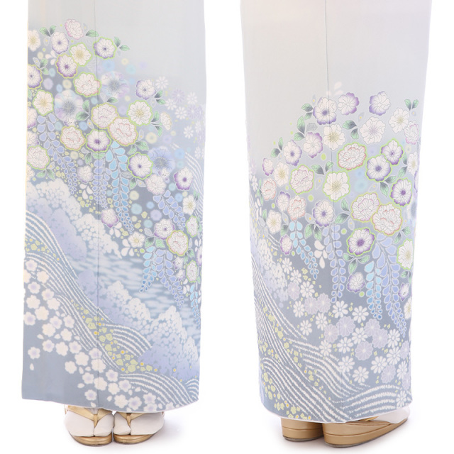 桂由美(YUMI KATSURA)の色留袖です。ウエディングデザイナーとして日本で草分け的な存在の桂由美は、着る人を360°どこから見ても美しく見せるデザインのウエディングドレスやカラードレスが多くの女性から人気を集めています。現在は打掛(うちかけ)や訪問着(ほうもんぎ)などの和装(わそう)も展開しています。オーガンジー素材の打掛など他に類を見ないフォトジェニックな新和装など、和装の伝統的な文化を大切にしながら桂由美のドレスの世界観を着物にも表現し、革新を吹き込むデザインは、多くの方々に人気を集めています。こちらの着物は辻が花(つじがはな)風のデザインです。辻が花文様は、室町時代末期から桃山時代にかけて大変な人気を誇った絞り染め(しぼりぞめ)を基調にした模様染めです。地色はホワイトからブルーを含んだグレーへのグラデーションに美しく染められて、ブルーの色調でまとめられた辻が花風のデザインが、清楚(せいそ)な印象です。芙蓉(ふよう)や藤(ふじ)の花が満開に咲き、桜(さくら)が水面を流れてるように描かれて、ホワイトの花々の周りのイエローがふんわりとした華やかさも感じさせます。花が満開の山々や雲、川の流れが遠くにぼんやりと見えて、まるで春の日の澄んだ美しい景色を見ているよう素敵な一着です。