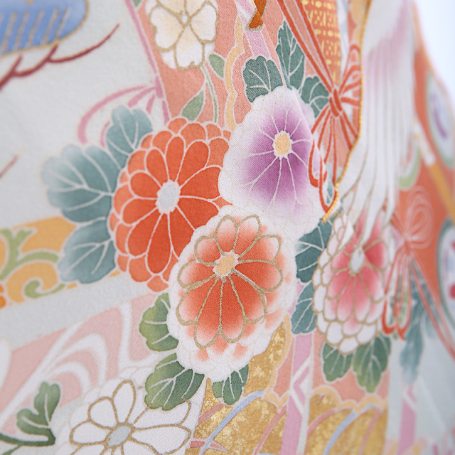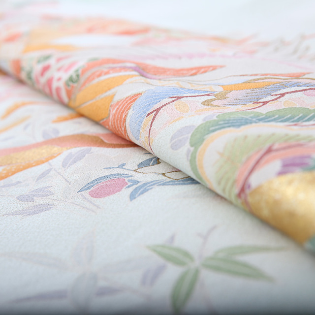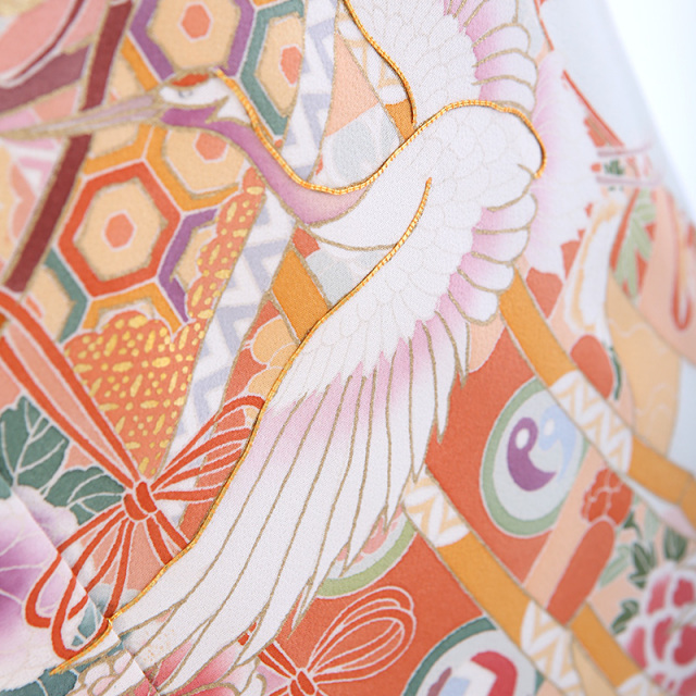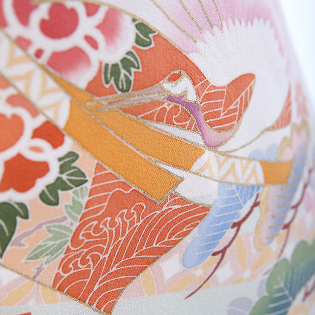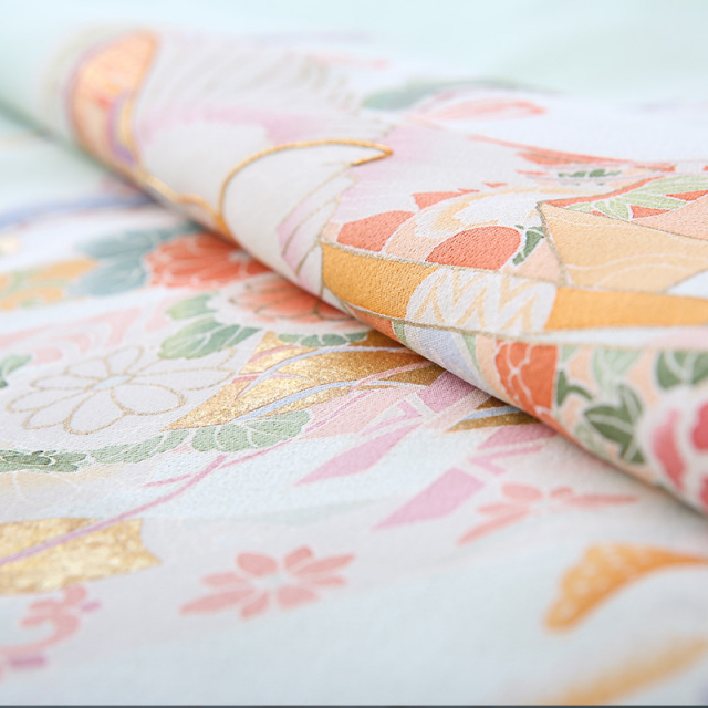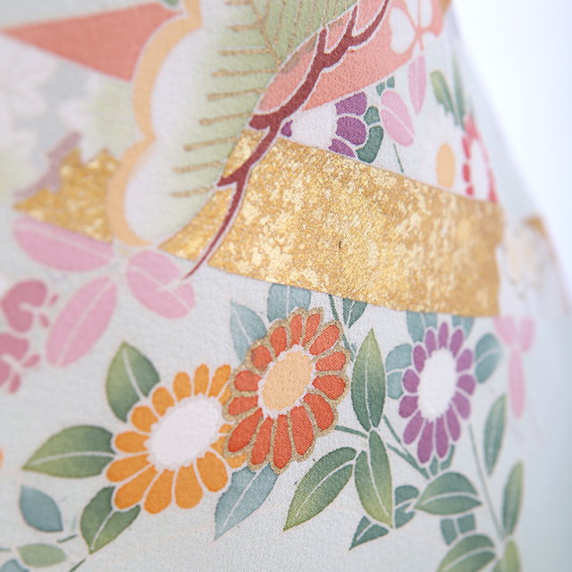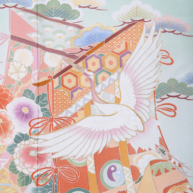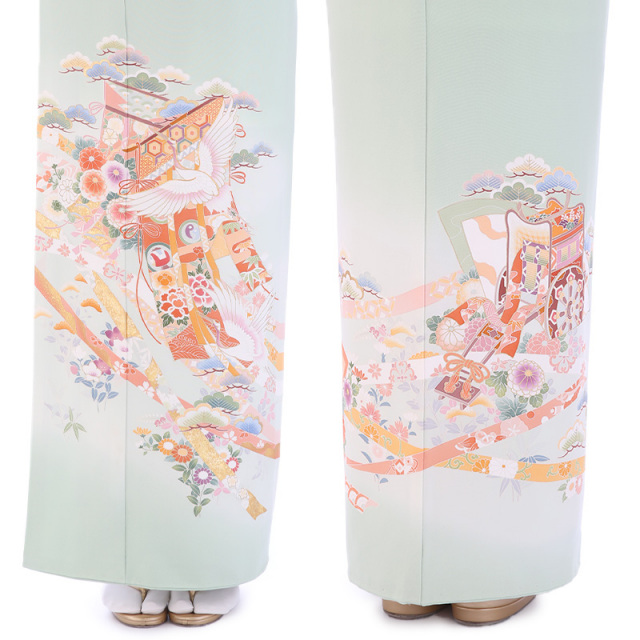 御所車(ごしょぐるま)と几帳(きちょう)に鶴が舞う優雅なデザインです。柔らかなグリーンの地色に華やかな平安時代を思わせる鶴や几帳、御所車が映えています。御所車は平安時代の貴族の乗り物であった牛車(ぎっしゃ)を指します。御所車は王朝文化(おうちょうぶんか)の象徴として、また「源氏物語(げんじものがたり)」の象徴として、その優雅な姿が多くの着物や工芸品に描かれてきました。几帳は平安時代(へいあんじだい)の物語絵巻(ものがたりえまき)によく見られる衝立式(ついたてしき)の二本の柱を立てて、その上に横木を渡して帳(とばり)と呼ばれる布を垂らしたもので、室内を仕切るカーテンのようなものです。物語絵巻には女性の前に置き目隠しにして会話をする様子も描かれています。様々な文様が描かれた帳が風に揺れる様子が華やかで、着物の文様にも好まれてきました。几帳の上を優雅に舞う鶴(つる)は穏やかな性質と長寿の鳥で、鶴亀(つるかめ)など吉祥(きっしょう)や瑞祥(ずいしょう)を表すモチーフであり、喜びや品位を象徴する文様です。淡いミントグリーンの地色にカラフルな文様が映える、お祝いの席にぴったりな上品に華やぐ素敵な一着です。