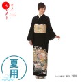 婚礼の席に華を添えるように優しく愛らしい色使いが魅力的です。また描かれる文様も縁起の良いものばかり。波の間から顔をだす2匹の鳥は「おしどり」です。おしどり夫婦という言葉があるように、2羽のオスとメスがいつも行動を共にし寄り添い合う様子は夫婦円満を意味しています。中心には大輪の花を咲かせた「牡丹」が描かれます。理想郷に咲く花と言われている「牡丹」はその姿から富貴や気品を表す文様です。また美しい女性を表す「立てば牡丹、座れば芍薬」という言葉があるほど、古くから愛されています。文様全体を包み込むような「波」は寄せては返し止まることのないことから、永遠の人生を意味する古典文様。「波」のように結婚生活もずっと続いて行きますようにという願いが込められています。婚礼のお祝いの気持ちが文様全体で表現された優しさ溢れる1着です。またこちらの黒留袖は夏用の単衣仕立てとなっています。6月から10月の暑い時期でも、黒留袖の美しさは変わらないままに、涼しく過ごすことができます。